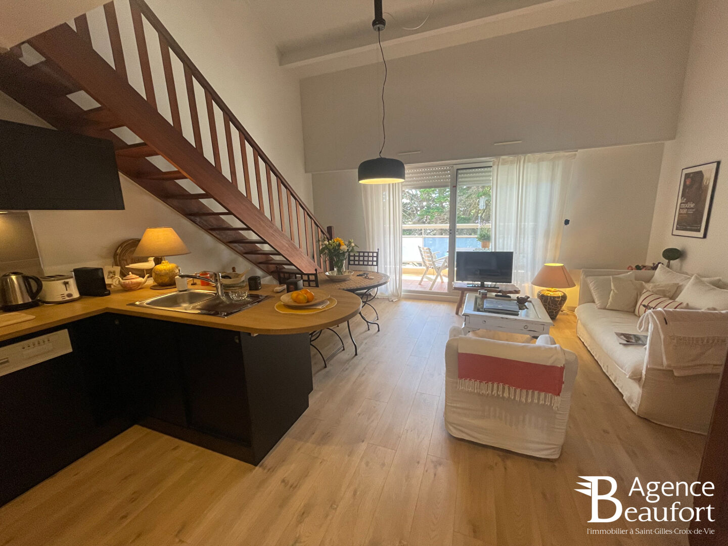 Exclusivité – A seulement 400 m de la plage de Boisvinet, bel appartement en parfait état de 64 m² habitables, situé au dernier étage d’une petite résidence comprenant : entrée, séjour-salon avec cuisine aménagée et équipée donnant sur balcon, une chambre + un mezzanine de 16 m², salle d’eau, wc et parking privé.