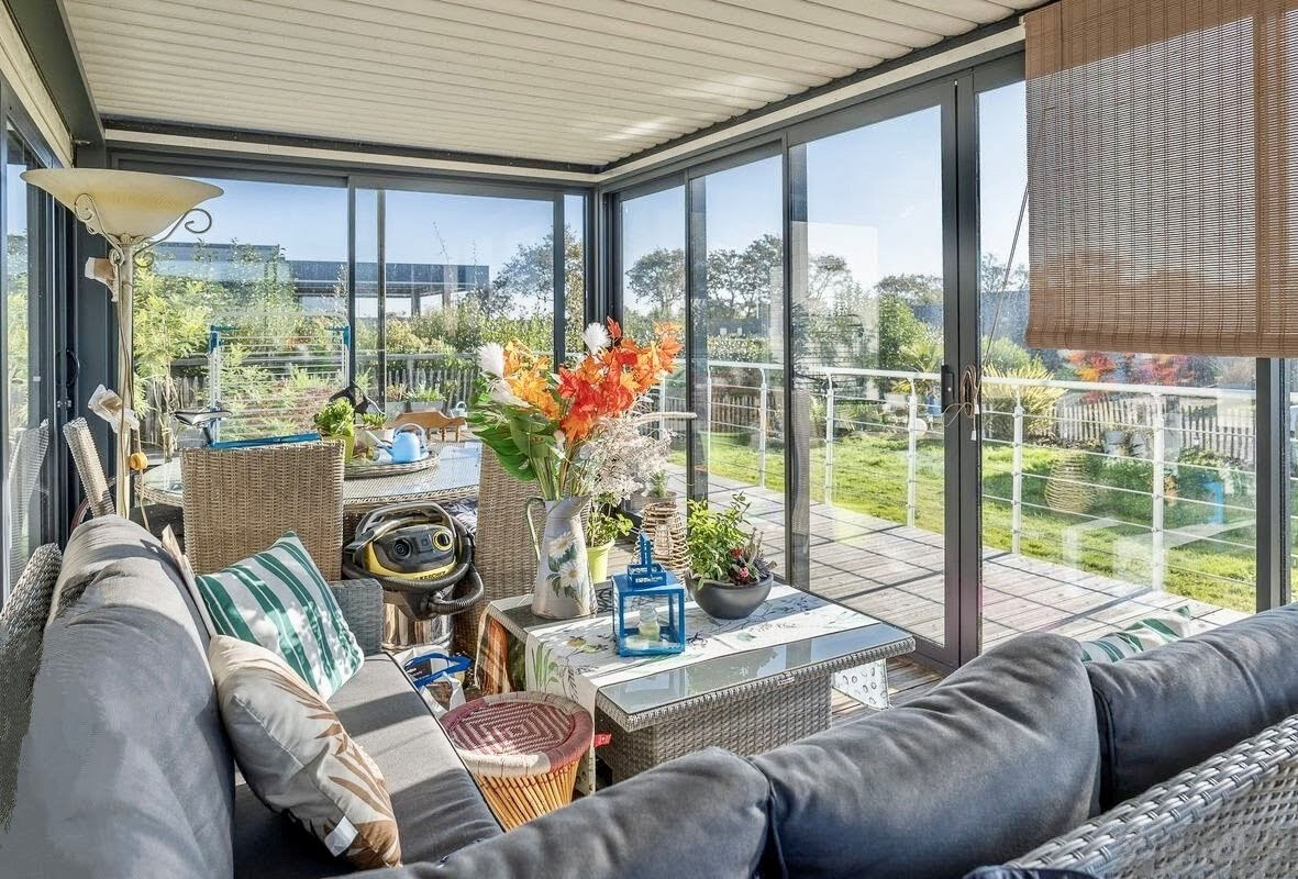 Grande terrasse de 110 m² exposée sud avec pergola bioclimatique de 18m² isolée par des baies vitrées à galandage en aluminium double vitrage.