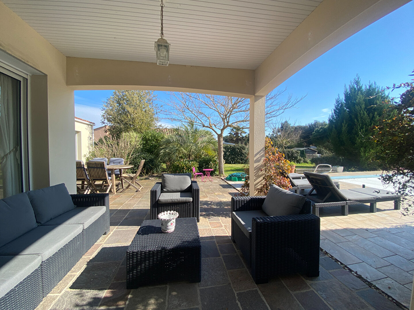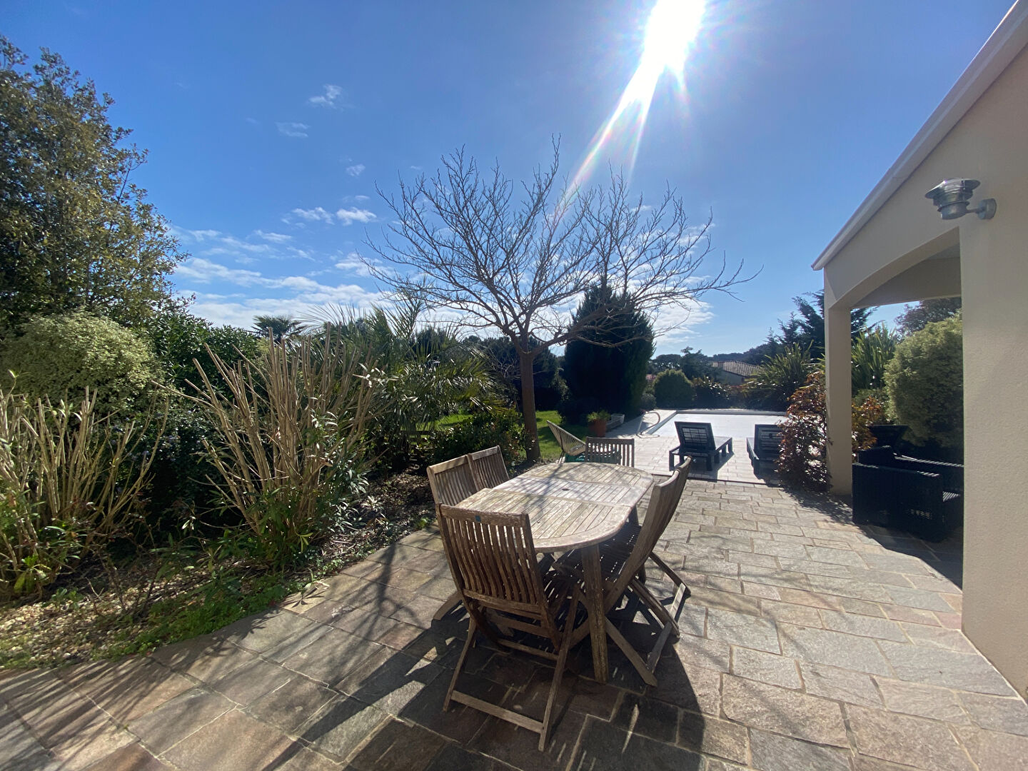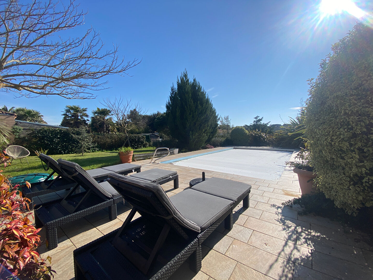 La maison est ouverte sur un parc clos et paysagé, avec piscine chauffée, pour profiter du cadre de vie privilégié.