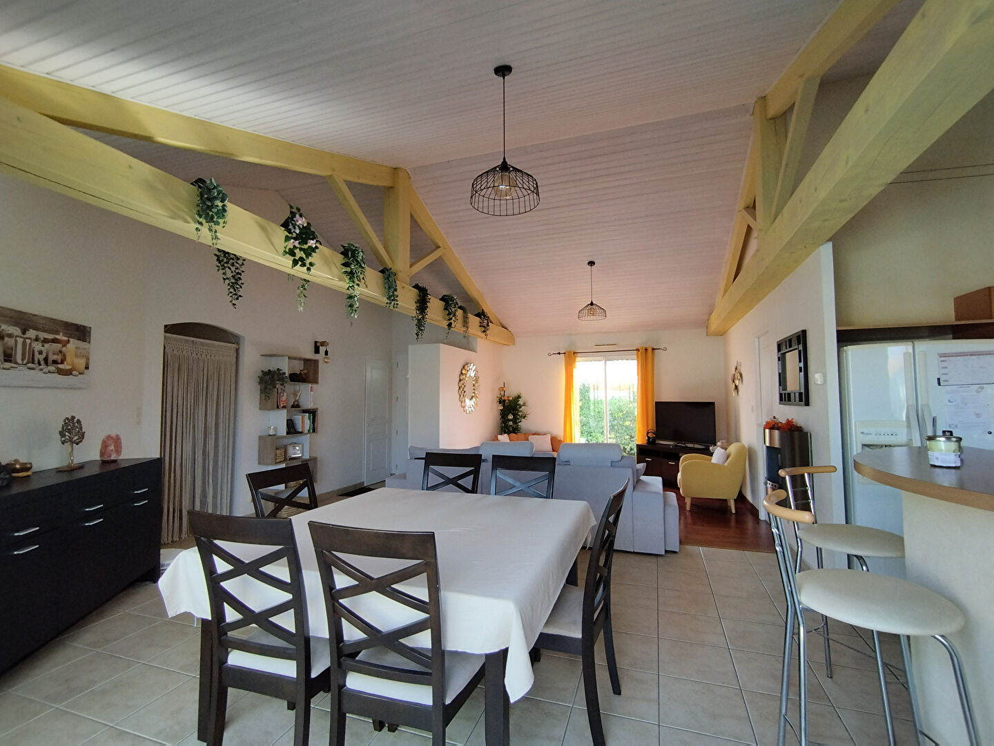 Dans un quartier agréable proche d’un supermarché et à 1.6 km de la plage de Tanchet, maison de plain-pied offrant une entrée avec placard, une belle pièce de vie cathédrale avec une cuisine ouverte équipée, 3 chambres dont une avec dressing, un bureau, une salle de bains avec douche et baignoire, 2 wc séparés, une buanderie et un garage. Une pièce d’été donnant sur la piscine a été aménagée, et bénéficie d’une salle d’eau wc. Piscine chauffée. Jardin clos sans vis à vis.