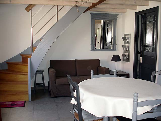 Maison meublée de 46m2, rénovation et aménagement chaleureux, avec terrasse en bois sur l’avant : séjour et son coin cuisine aménagée et équipée, wc et à l’étage : chambre et salle d’eau – Chauffage électrique – Stationnement devant la maison