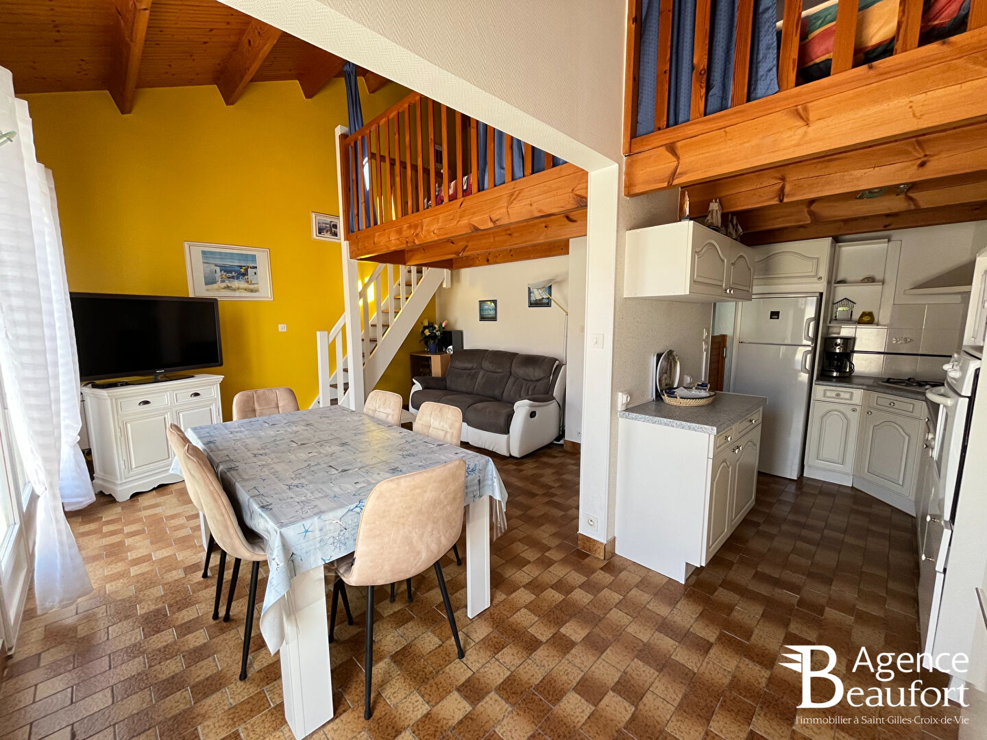 Exclusivité AMEPI – à 400 m de la plage de Boisvinet, proche des commerces, du port et de la gare. Maison en excellent état offrant une entrée, pièce de vie avec cuisine aménagée, chambre, salle de bains et WC. Grande Mezzanine avec une chambre, une cabine et une salle d’eau avec wc.
