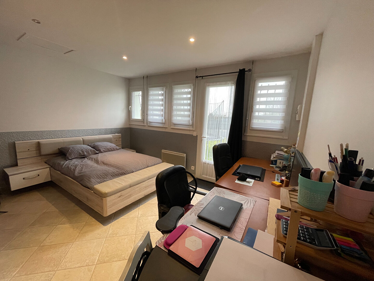 L’escalier en bois situé dans l’entrée permet l’accès à l’espace nuit composé de deux chambres, un bureau, un dressing, une salle de bains et WC indépendant.